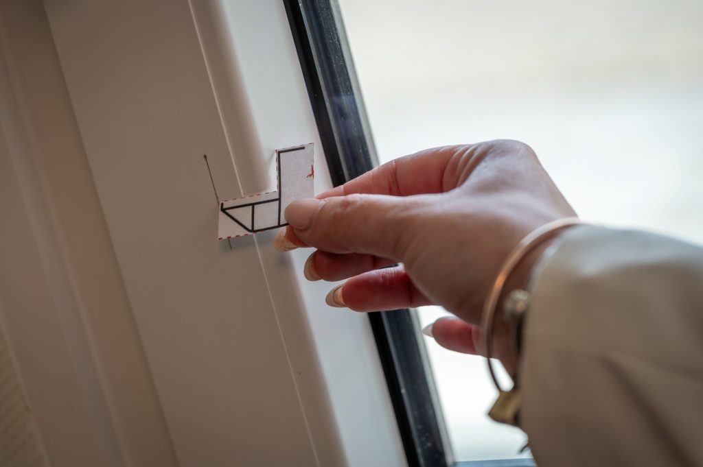 Markeer de breedte op het kozijn met behulp van het passtuk op drie verschillende punten. Noteer de kleinste gemeten breedtemaat tussen de markeringen en verminder deze met 3 mm. Deze aangepaste maat is de te bestellen breedte.