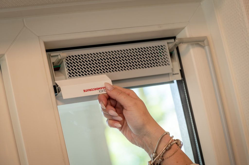 Indien er een ventilatie-rooster op het glas is geplaatst, plaats het passtuk dan tegen het rooster. Het passtukje mag aan de onderzijde van het rooster een beetje overlappen, maar mag de luchtstroom niet belemmeren. Meet vervolgens de hoogte tussen de onderste markering en de onderkant van het rooster en verminder deze met 3 mm. Deze aangepaste maat is de te bestellen hoogte.